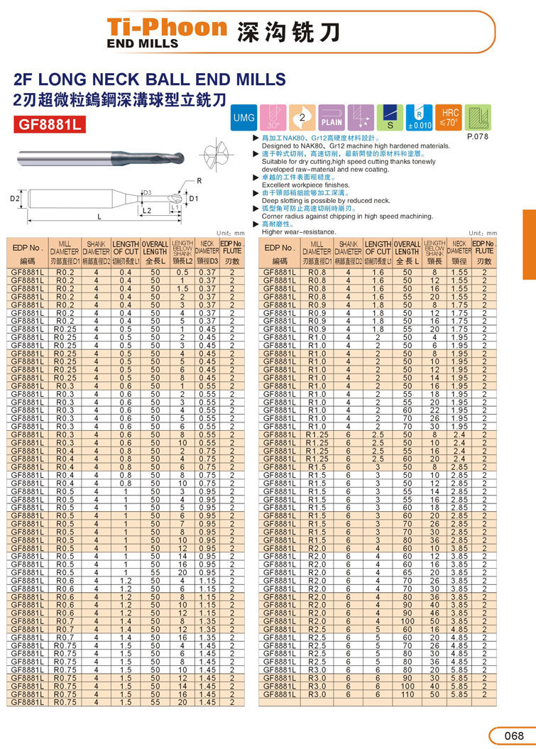 2刃球型超微粒鎢鋼深溝立銑刀068