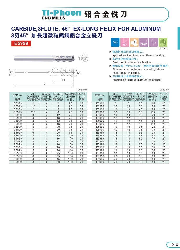 2. 2刃加長鋁合金銑刀 014