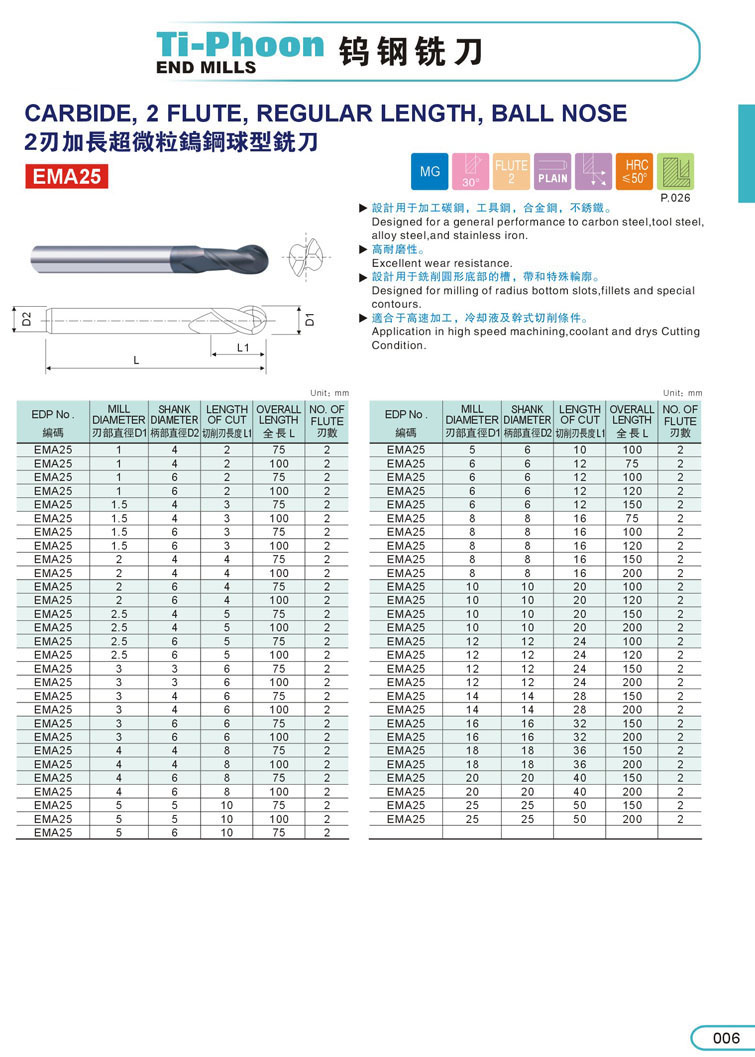2刃加長球型超微粒鎢鋼立銑刀006