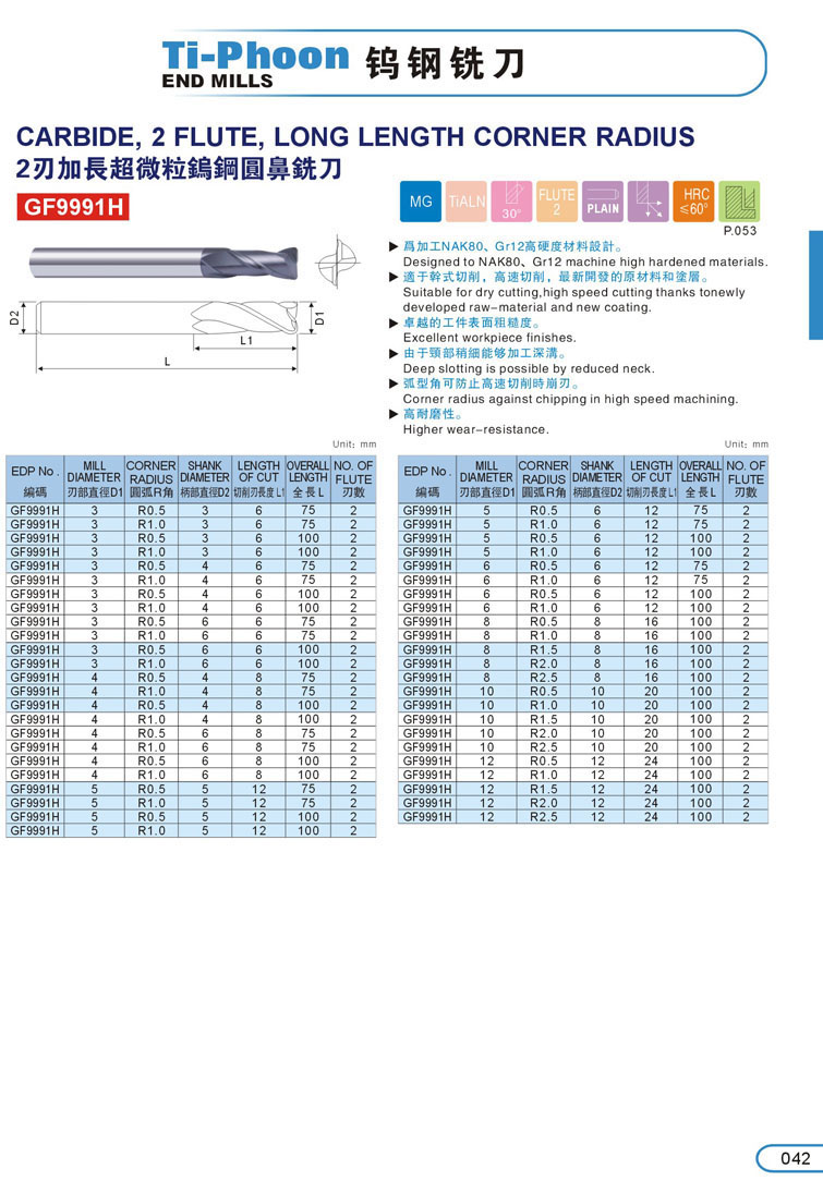 8. 2刃加長超微粒圓鼻鎢鋼立銑刀042